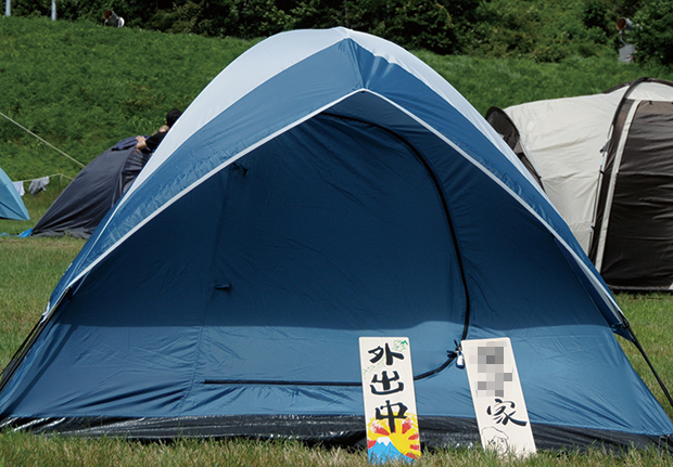 悲しいことだが留守中のテントを狙った盗難も発生している。テントに鍵をかけるという方法もあるが、万全ではない。他のリスクマネジメントとしては、隣近所の人たちと仲良くなっておくこと。怪しい人がテントに近づいたら注意してくれる。乱雑に散らかっているテントは狙われやすいので、整理整頓も重要。何より貴重品は置きっぱなしにしないことが肝心だ。