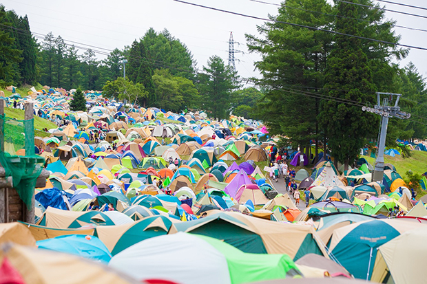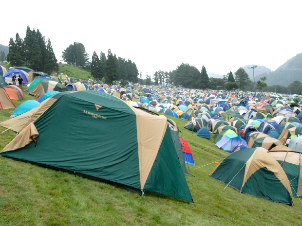 下の写真を見て驚くなかれ、こんな斜面にもテントが ! 普通だったらありえないがこれもフェスならではの光景。これは極端な例だがフジロックのキャンプサイトはスキー場のゲレンデ内なので少なからず傾斜はある。朝霧ジャムのAサイトがある朝霧アリーナもステージに向かって緩やかな斜面になっている。こういう斜面に寝る場合、頭を山側にして、足のほうをバックパックや荷物で高くすればリクライニングシートのような状態で寝られる。お尻の下に百円ショップなどで売っているカーペット用滑り止めのシートを敷いておくとずれにくい。