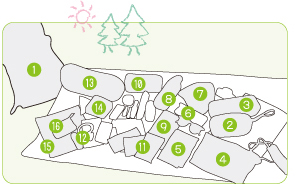 ①バックパック ②雨具 ③防寒着 ④サコッシュ ⑤手ぬぐい ⑥サングラス ⑦帽子 ⑧水筒 ⑨マスク ⑩化粧ポーチ ⑪ファーストエイド ⑫モバイルバッテリー ⑬折りたたみイス ⑭汗拭きシート ⑮ファスナー付きポリ袋 ⑯財布