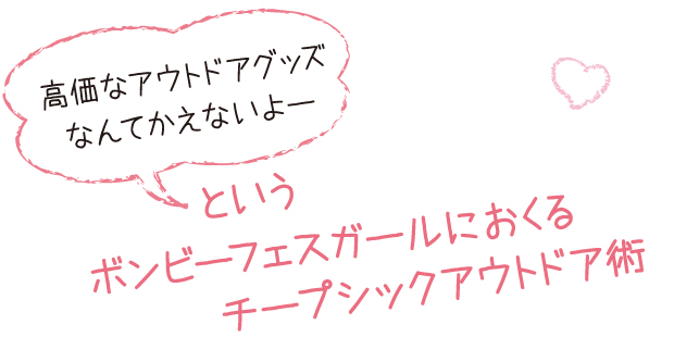 次のページでは、「高価なアウトドアグッズなんてかえないよー」というボンビーフェスガールにおくるチープシックアウトドア術を紹介!