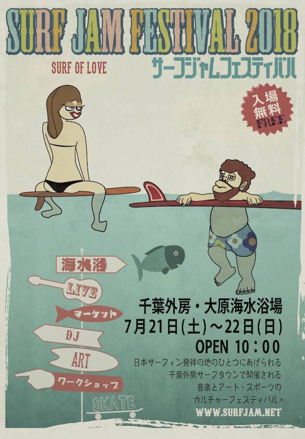 いすみ市の大原海水浴場では、入場料無料のフェス「SURF JAM FESTIVAL」が次の週末に開催される。出演するのは、フェス番長のDachamboをはじめ、 ズクナシ、Muffなど。フェスなのだから、ステージだけではなくマーケットゾーンも設置される。