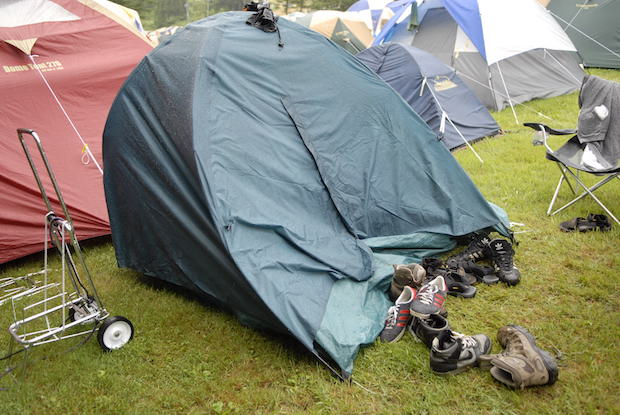 風雨が強まると、トラブルが続出するのがキャンプサイト。地面への固定が甘いテントは吹っ飛び、内部に水が浸入するようなヒサンなトラブルが続発します。ライブ会場へ向かう前に、かならずテントの張り綱をしっかりテンションをかけて張り直し、ペグの緩みがないかを確認。テント生地がピンと張った状態にしておけば雨のしみ込みも防げます。