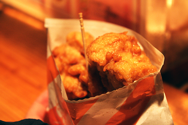 だんだんお腹もくちくなってきたので、ひとくち餃子をチョイス。生地も薄くておやつ感覚で軽く食べられていいですね。餡の味はしっかりしてるので、餃子のタレをつけなくても美味しいです。もちろんタレありでも。冷めると少し固くなるので、アツアツのうちがオススメ。