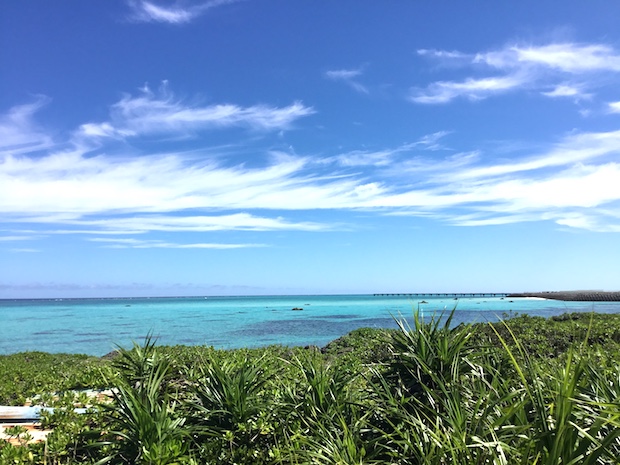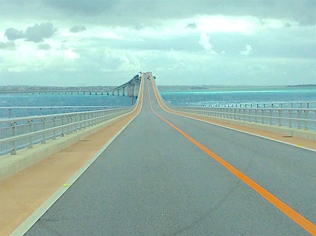 (上)2015年の1月に開通した伊良部大橋。全長約3.5kmもの海上の橋で、ここ自体が観光名所のひとつになっている。(下)右手奥に見えるのが下地島空港。目の前は、まさしく宮古ブルーを湛えた南国の海! 地元のひとたちが「これ、バスクリン混ぜてるさぁー」とふざけ合うほどの青。