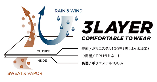 レインウェアなどに使われている3LAYER生地「AETX-TECH」は、柔らかな着心地とともに、耐水性と透湿性、さらに耐久性にも優れ、UVカット率も90%以上と晴天時にも大活躍。