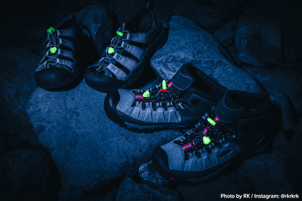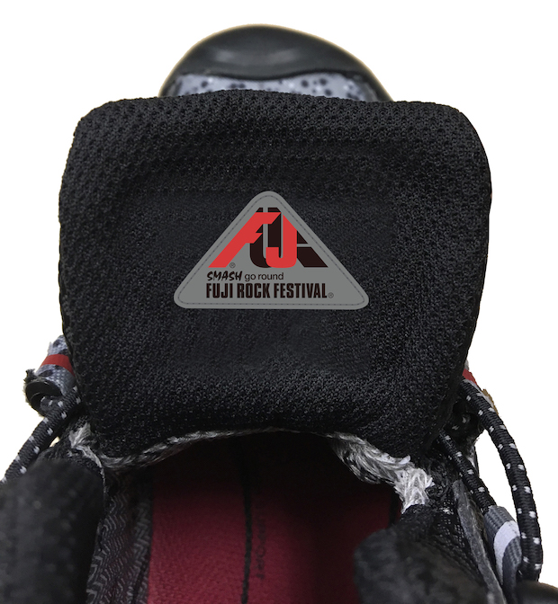 脱ぎ履きのしやすいバンジーコード仕様のシューレースに、暗がりでも目立つ蓄光のアローヘッドとリフレクターを採用するなど、細部にまで「フジロックで遊ぶ」ことにこだわっている。