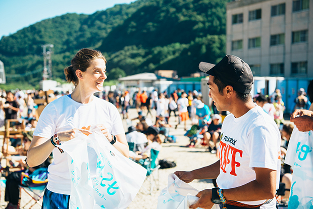 外国からのお客さんにもゴミ袋を渡し、会場内にゴミステーションがあることを伝える。(写真=Kaoru Ito)