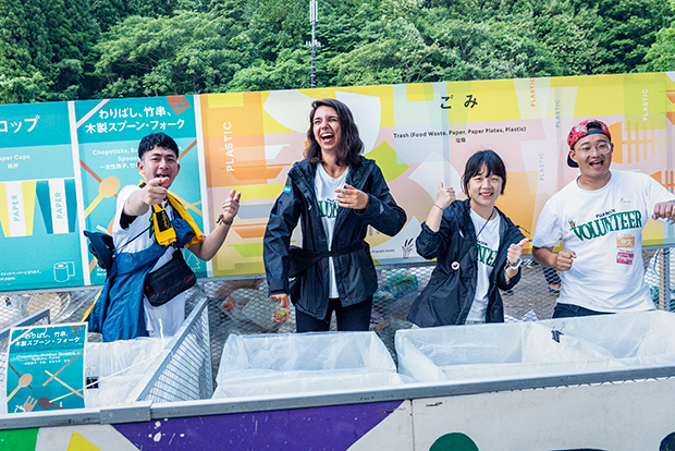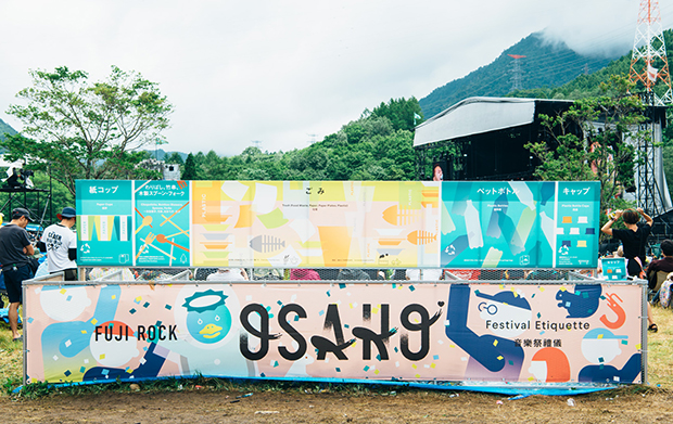 昨年からフジロックでは「OSAHO<お作法>」というキャンペーンを開始した。アニメーションや音楽を使って「BUNBETSU(ゴミの分別)」「BUNEN(分煙)」「KAPPA(傘を使用しない)」などといったフェスでのエチケットを再度共有しようというもので、会場内や各ステージでもアナウンスされた。フジロックでは、長年に渡り「ゴミゼロナビゲーション」を行なってきたが、外国語でのアナウンスが少なかったのも事実。その点を改善するために看板には英語や中国語も表記し、胸に「English」や「中文」といったステッカーをつけたボランティアも配置している。