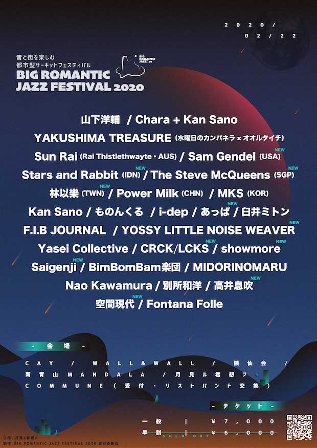 出演:山下洋輔、Chara + Kan San、YAKUSHIMA TREASURE(水曜日のカンパネラ×オオルタイチ)、臼井ミトン、F.I.B JOURNAL、YOSSY LITTLE NOISE WEAVER、Yasei Collective、Sun Rai(AUS)、Sam Gendel(USA)、Stars and Rabbit (IDN)、The Steve McQueens(SGP)、林以樂(TWN)、Power Milk(CHN)、MKS(KOR)、ほか
