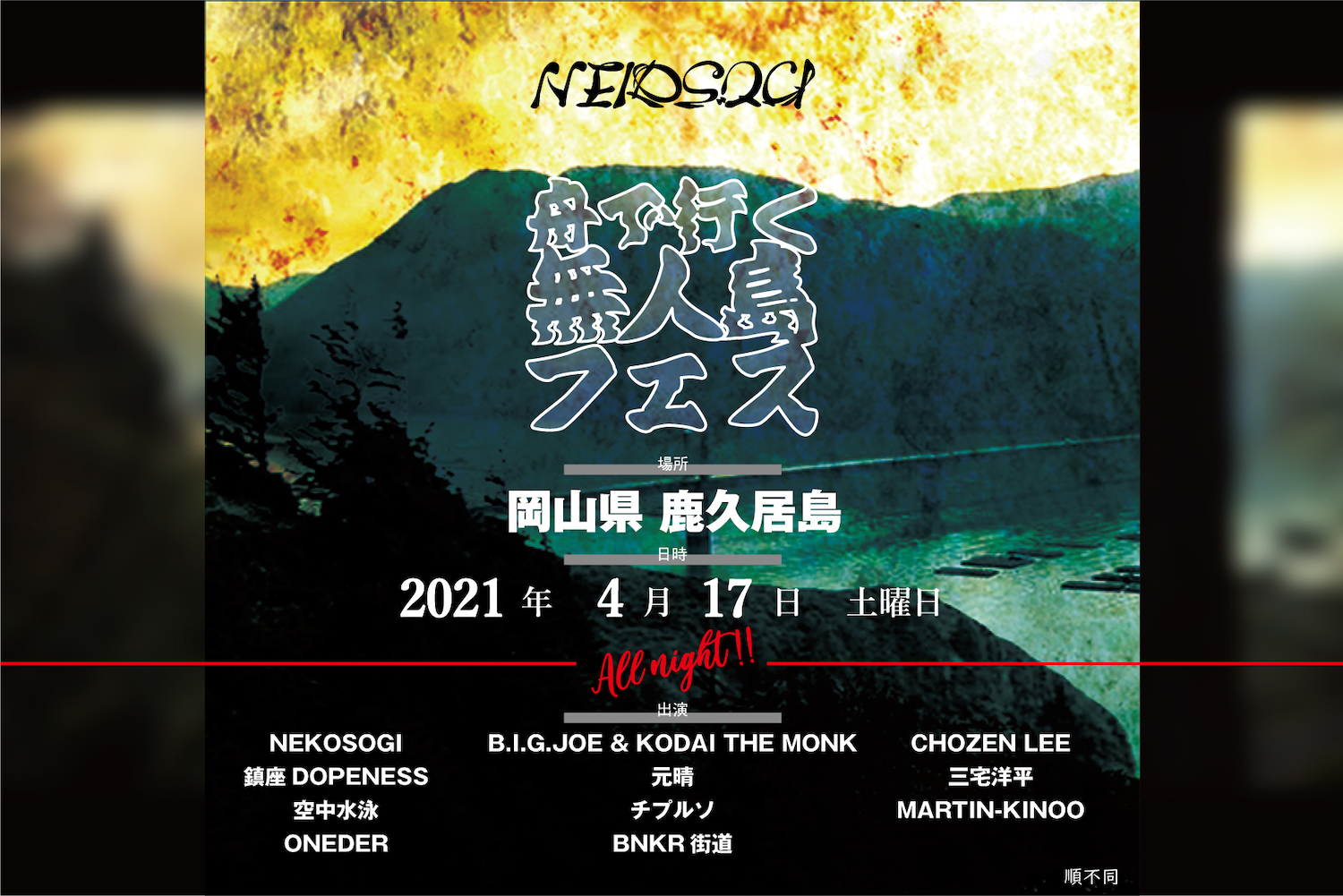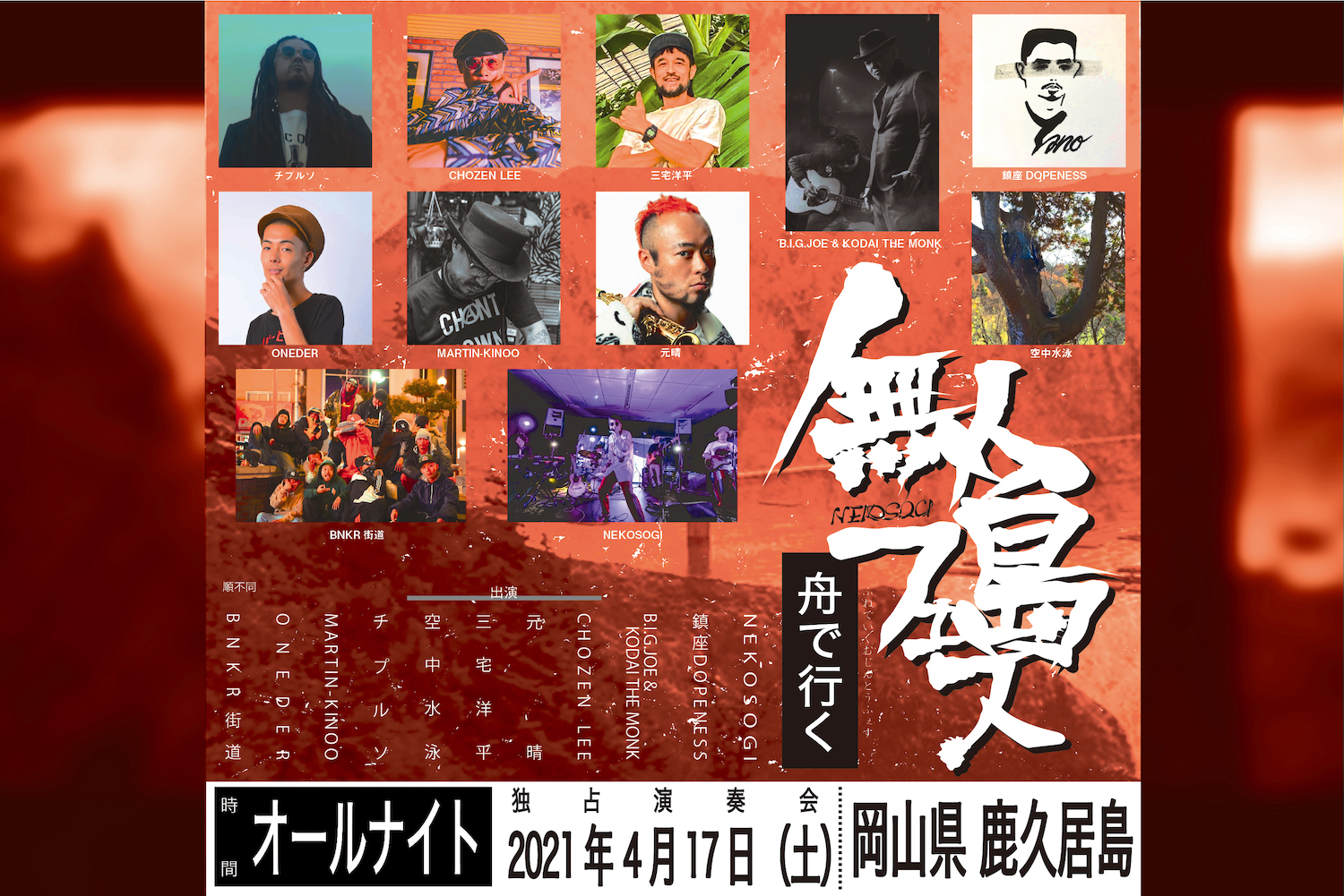 出演:NEKOSOGI、三宅洋平、鎮座DOPENESS、CHOZEN LEE、元晴、空中水泳、他