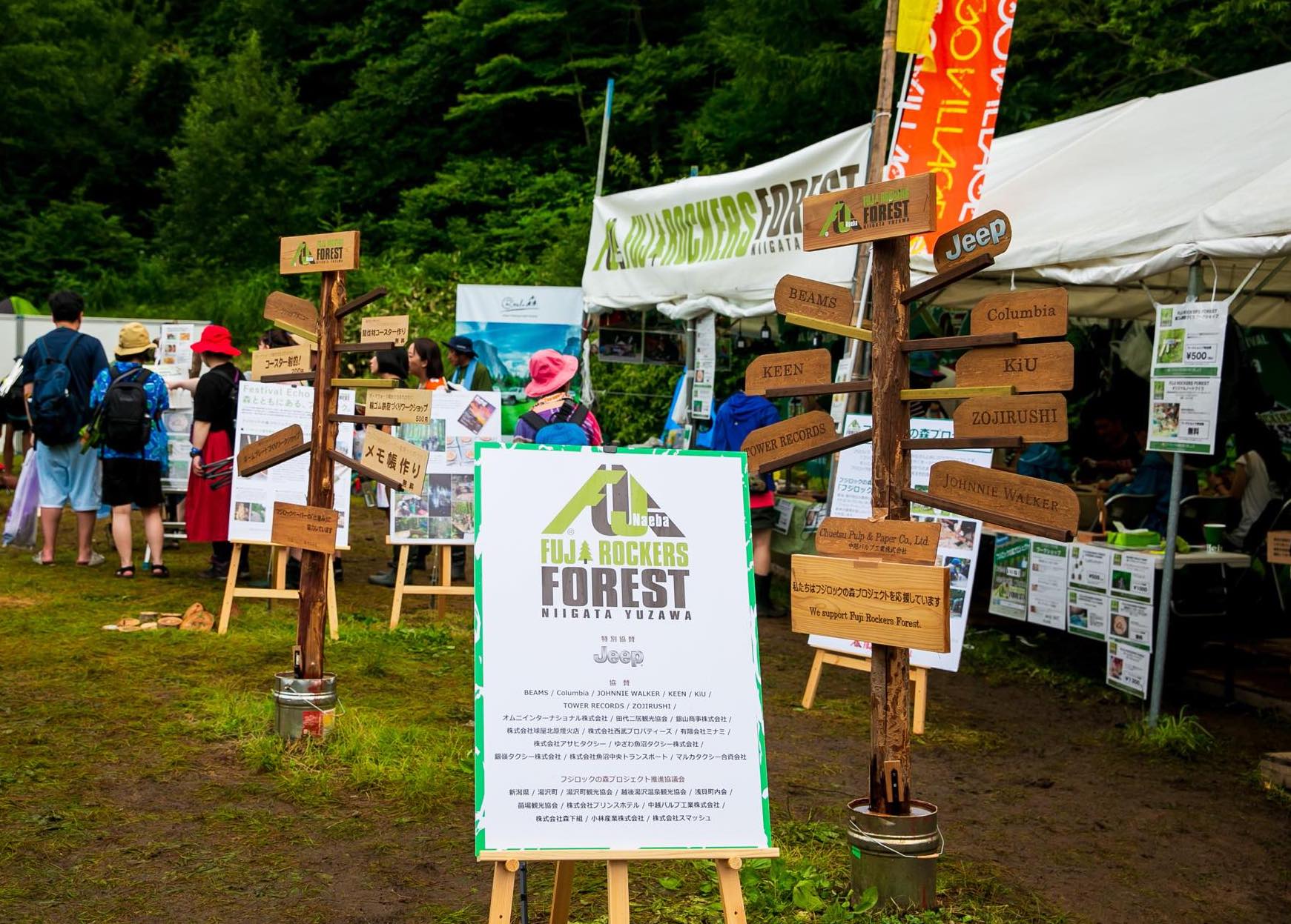 会場内の森はFUJIROCKERS FORESTと名付けられ、誰もが歩ける森として整備され、間伐材は飲食出店で使う箸や、フライヤーやフリーマガジンの紙として再生されている。
