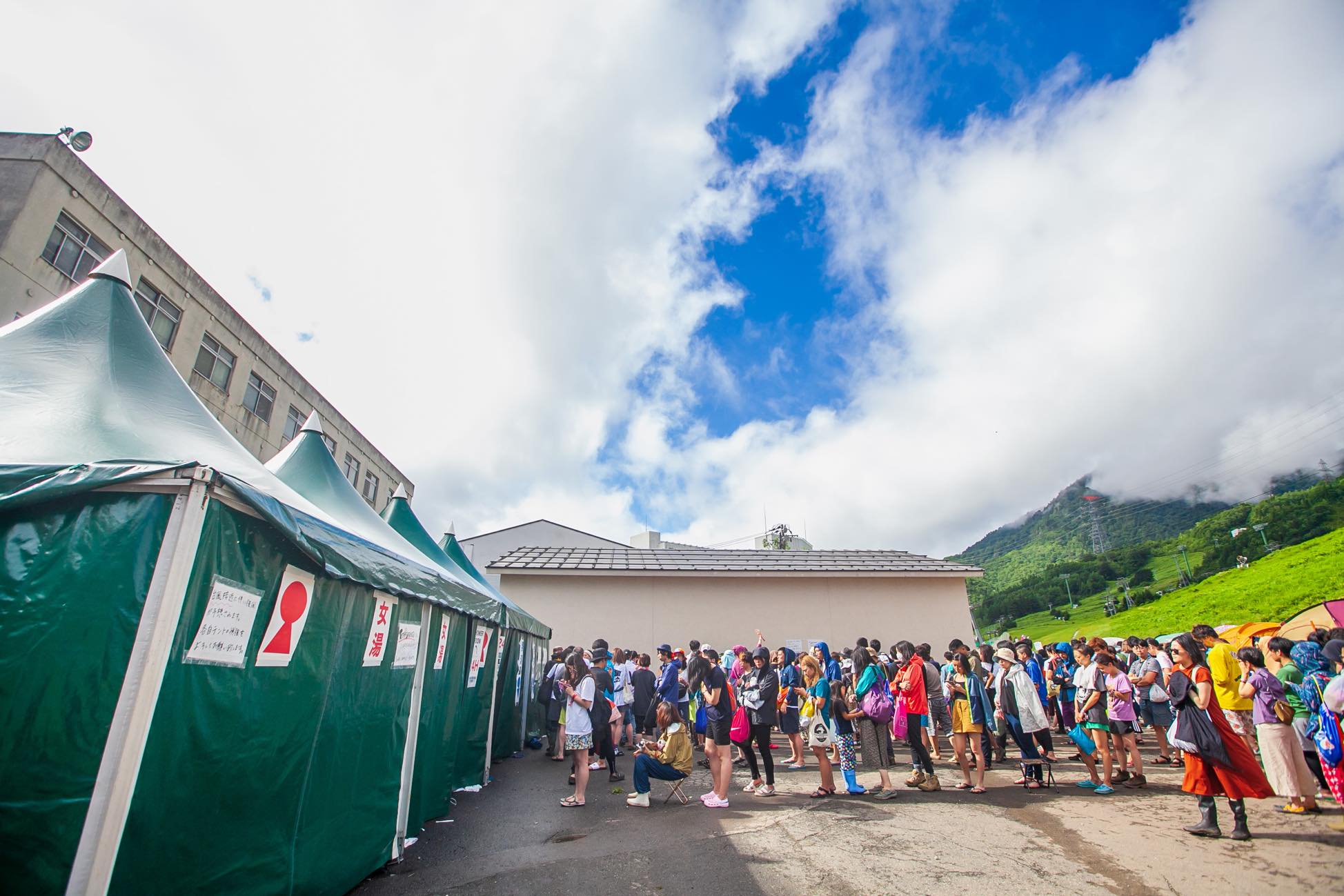 晴れた朝にはシャワー待ちの列が伸びるが、青空の下、爽やかな高原の風に吹かれながらのんびり待つのもわるくない