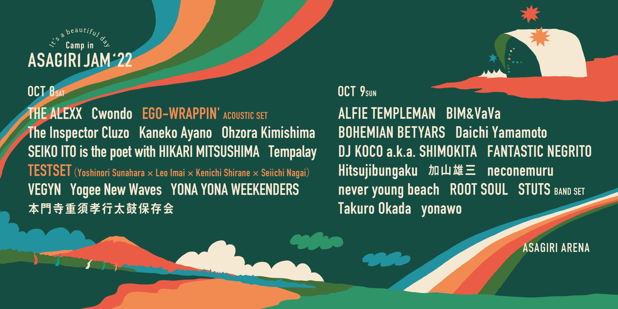 10月8日(土):THE ALEXX、Cwondo、EGO-WRAPPIN' [Acoustic Set]、The Inspector Cluzo、カネコアヤノ、君島大空、いとうせいこう is the poet with 満島ひかり、Tempalay、TESTSET (砂原良徳×LEO今井×白根賢一×永井聖一) 、VEGYN、YOGEE NEW WAVES、YONA YONA WEEKENDERS、本門寺重須孝行太鼓保存会