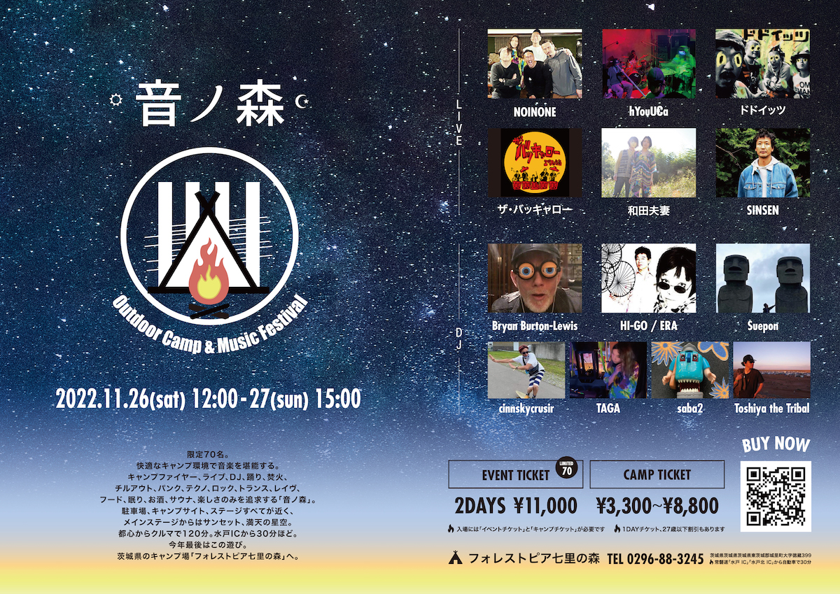 茨城県北西部にあるキャンプ場で初開催される野外フェス。フジロックで「オールナイトフジ」や「Day Dreaming」をオーガナイズしてきたブライアン・バートン・ルイスなどが出演する。90年代後半に起こったパーティーカルチャーを、今に、そしてみらい繋ぐ時間になるはず。27歳以下の入場料が抑えられているのも、次世代にカルチャーをバトンタッチしていく思いからの他ならない。