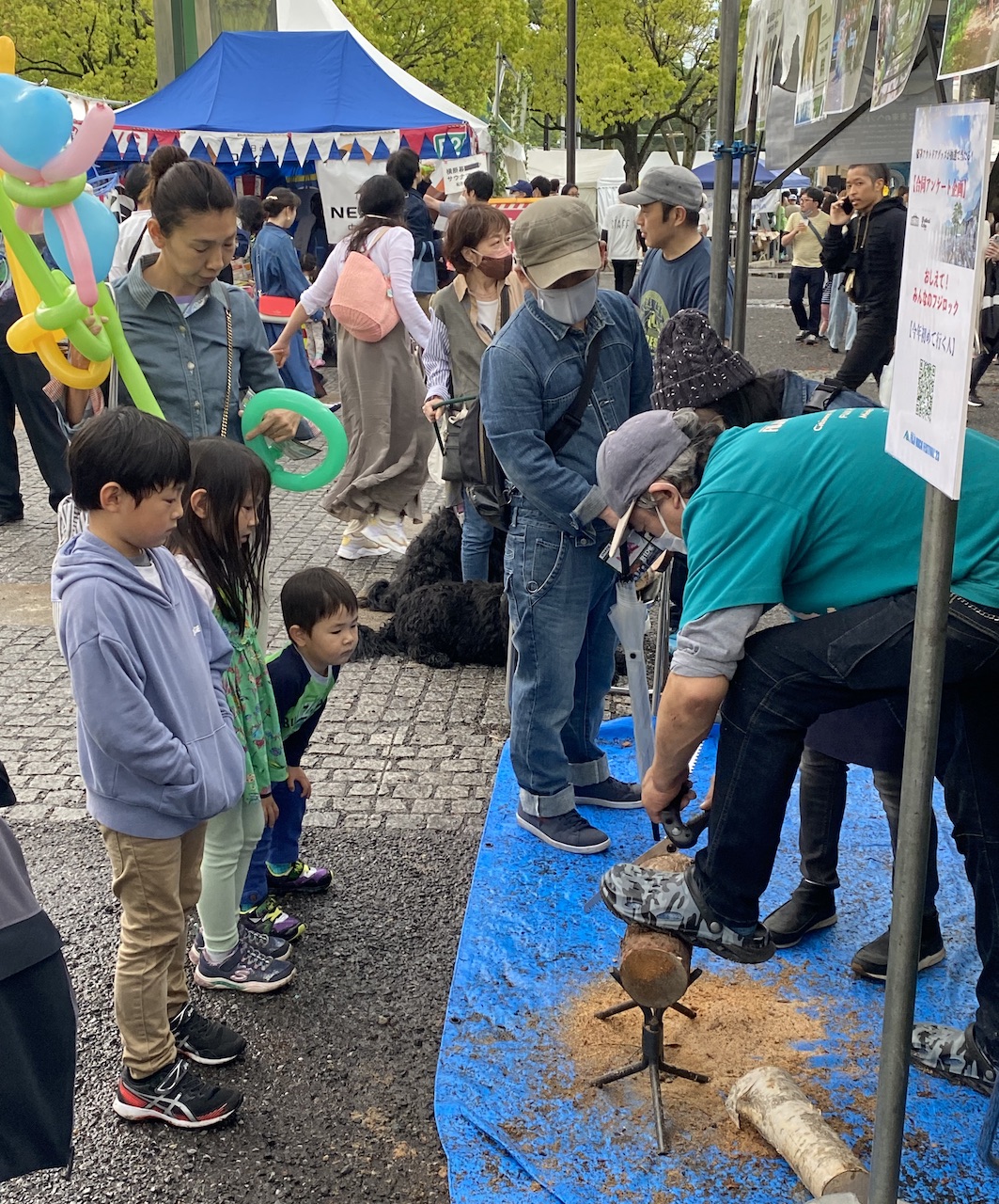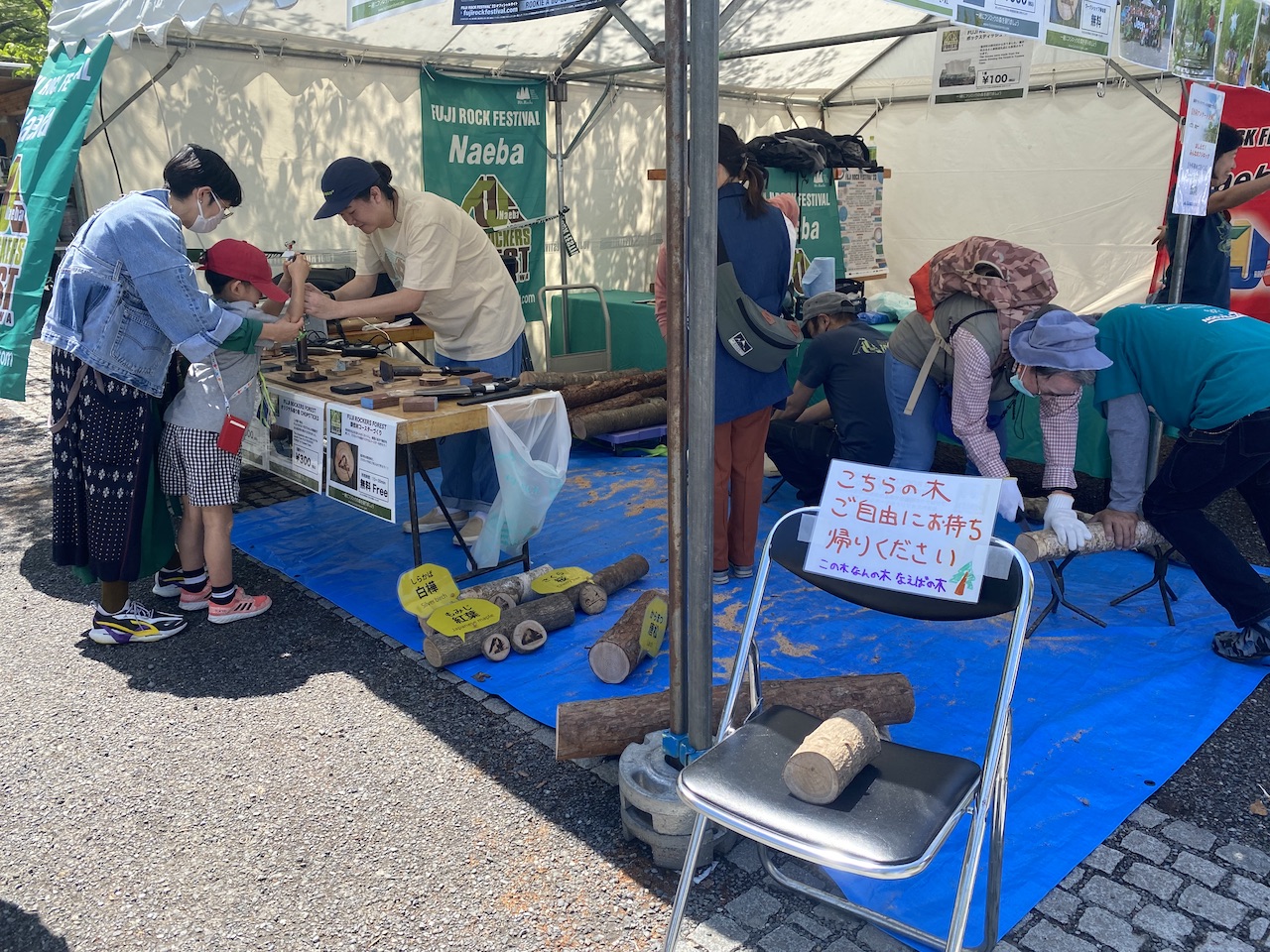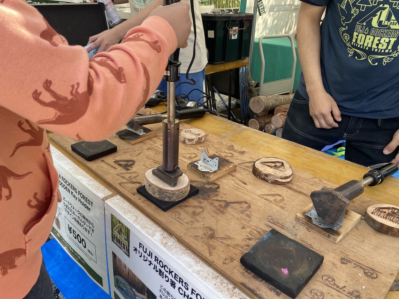 ブースでは、2011年から新潟県や湯沢町と一緒に行なっている会場周辺の森の整備や環境を守るフジロックの森プロジェクトの活動を多くの人に知ってもらう体験型のワークショップを開催。会場のある湯沢町からもスタッフの方がやってきて、さまざまな樹種の木材を使った丸太切り&コースター作りワークショップを実施。それら間伐材を使ったグッズなども販売し、家族連れなど多くの参加者で連日、順番待ちの列が途絶えることなくことなく賑わっていました。