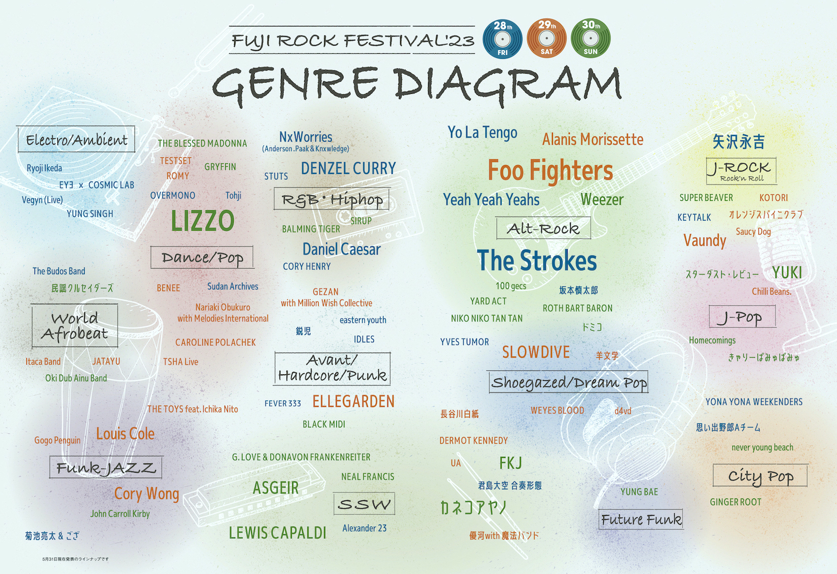 【FUJI ROCK FESTIVAL’23 GENRE DIAGRAM】傾向と対策はこれで完璧。 音楽ジャンルがひと目でわかるフジロック出演アーティストの音楽位置。