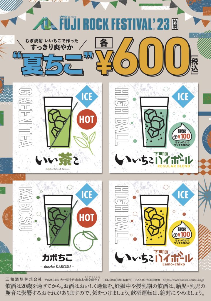 2023年のフジロックで、「いいちこ」を楽しむには……今年は、レッドマーキー前ではなく、オアシスでの展開を予定している。数万人の胃袋を満たすフードのアミューズメントパークに、「いいちこ」ブースの登場である。商品のラインナップは、「いい茶こ」「いいちこ下町のハイボール REGULAR BLEND」「いいちこ下町のハイボール Lemo-chiko」「カボちこ」の4種類。さらに、フェス限定のトッピングメニューもあるというから楽しみだ。