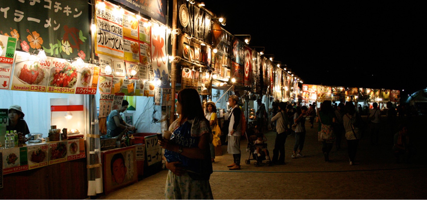フェスでのフードエリア。地元飯だけではなく、全国各地の味が集う。フェスが各地で開催されるようになって、そのフェスの特徴がフェス飯にも現れるようになっている。