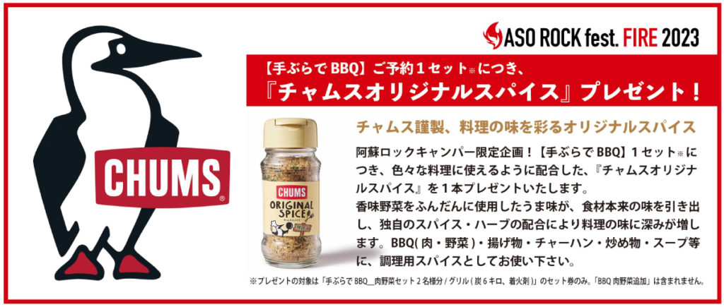 今年の阿蘇ロックキャンプはナイトイベントや焚き火イベントなどキャンパーが楽しめる要素がもりだくさん。そこに加えて、BBQプランもある。なんとBBQを予約すれば、CHUMSのオリジナルスパイスがもれなく付いてくるとのこと。食材にコンロもセットということなので、持って上がらなくていいのは嬉しい。場所指定になるが、それでも音楽を聞きながらのBBQなんてサイコーだ。