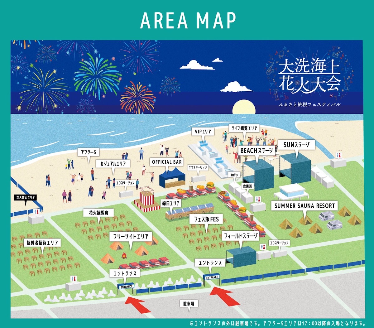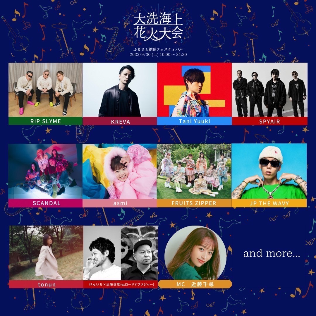 歴史を重ねてきた海上花火大会に、ライブを融合させるスタイルで去年開催された「大洗海上花火大会 納税フェスティバル」。有料席をふるさと納税の返礼品として販売。RIP SLYME、KREVA、Tani Yuukiらのライブだけではなく、フードエリアやサウナなど、フェスのコンテンツを組み入れ、まったく新しい花火エンターテインメントとして再生させ、今年で2回目の開催となる。昨年の倍の1万2千発の花火が、大洗の太平洋に上がる。