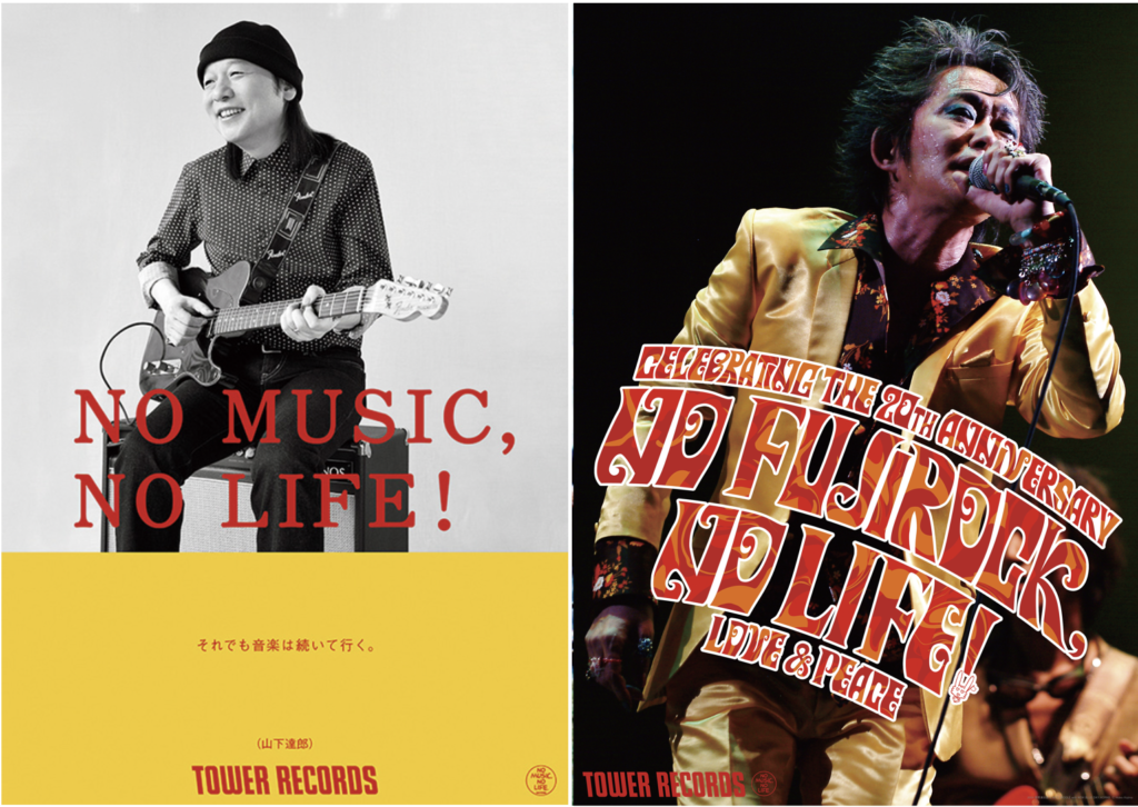 (左)日本を代表するミュージシャンの多くが起用されてきた「NO MUSIC, NO LIFE.」のポスター。2025年のフジロックへの出演が話題の山下達郎も複数回登場している。(右)20周年の際につくられた「NO FUJIROCK, NO LIFE!」のポスター。苗場のステージで歌う忌野清志郎の写真が使われた。NO MUSIC, NO LIFE.の歴代ポスターはこちらにアーカイブされている。