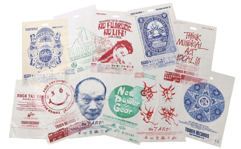 タワーレコードが初回のフジロックに参加したきっかけは、そのコンセプトに共感してというわけでもなく、社長が友人から頼まれたからだった。直前に行くことになったのだから碌に準備もできずに、何か物入れにでも役立つだろうと、LPサイズのレコードバッグだけたくさん持って行ったそうだ。