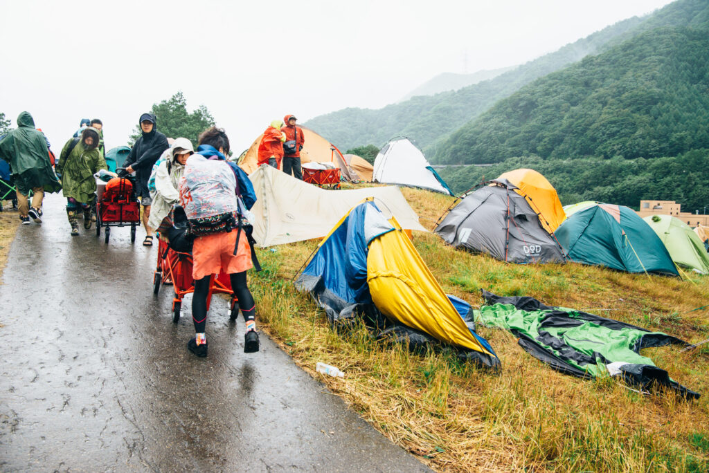 野外で開催される音楽フェスはとてもピースフルな雰囲気が漂い、だれもが楽しめる場所。ではあるものの、それは、天候の安定しているときの話。そもそも一日のすべてを野外で過ごすこと自体が、現代に生きるわれわれにはめずらしきこと。それだけでもかなり体力を使うのに、雨が降り、風が吹けば、より一層の準備と心構えが必要となる。ステージの端から端まで歩けば、たとえばフジロックなどでは片道4kmほど。たとえ雨風が激しくなろうとも、自分のテントは遥か彼方なんてこともよくあること。野外フェスは過酷である。これを前提としておけば、少しは気持ちも楽になる!?