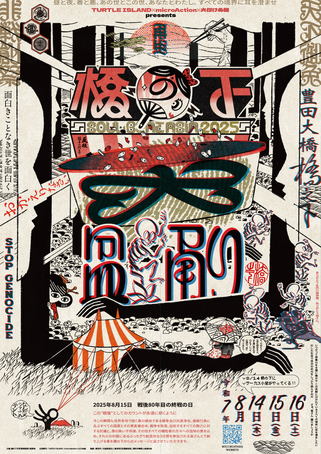 戦後80年(昭和100年)にあたる今年は、旧盆に「盆踊り」として開催される。日本各地やアジアに根付いている大衆芸術をマツリのなかで混合させる。そこで生まれるのは唯一無二のものだ。トゥバ共和国からやってくるフンフルトにも注目。熱中症に注意を。