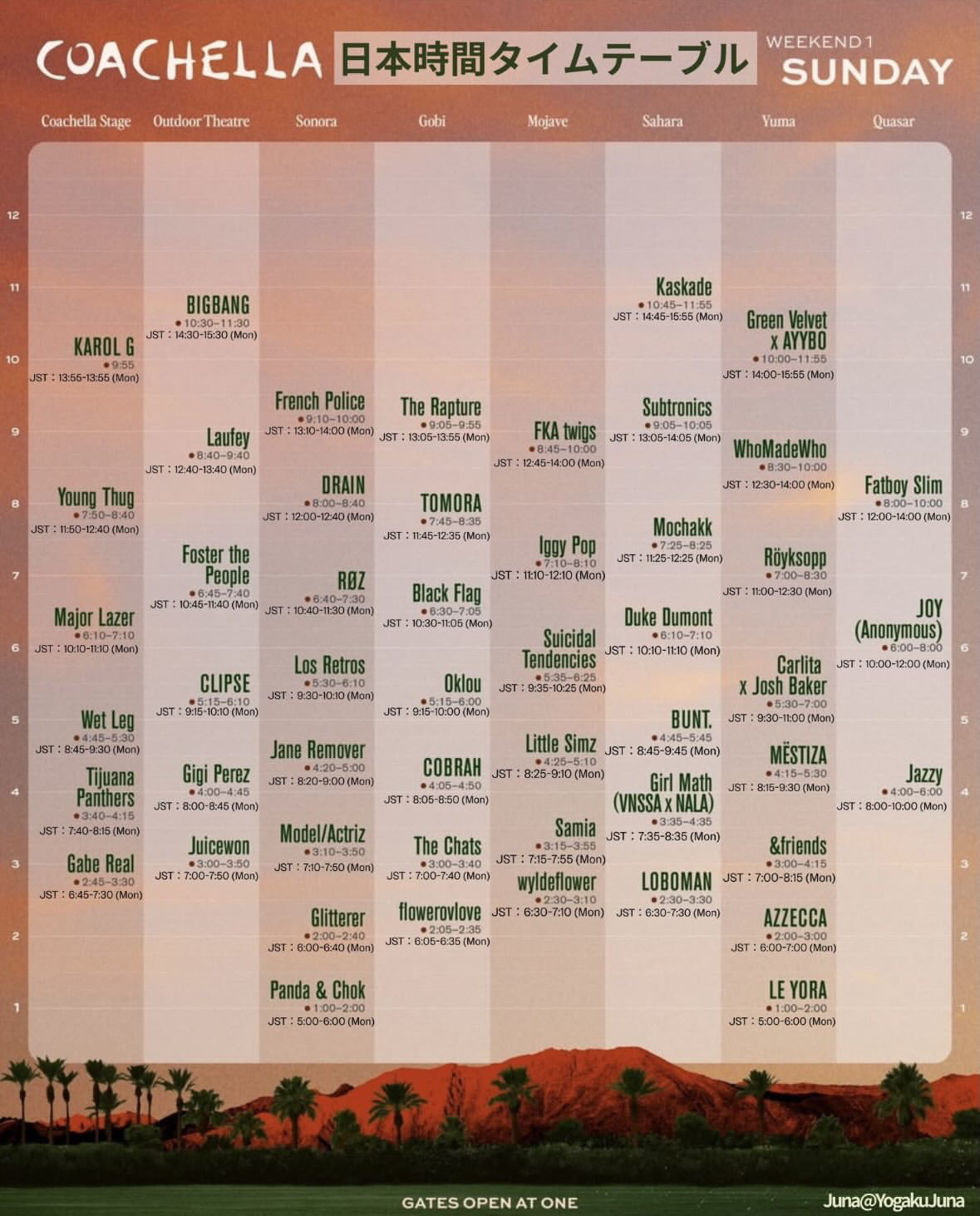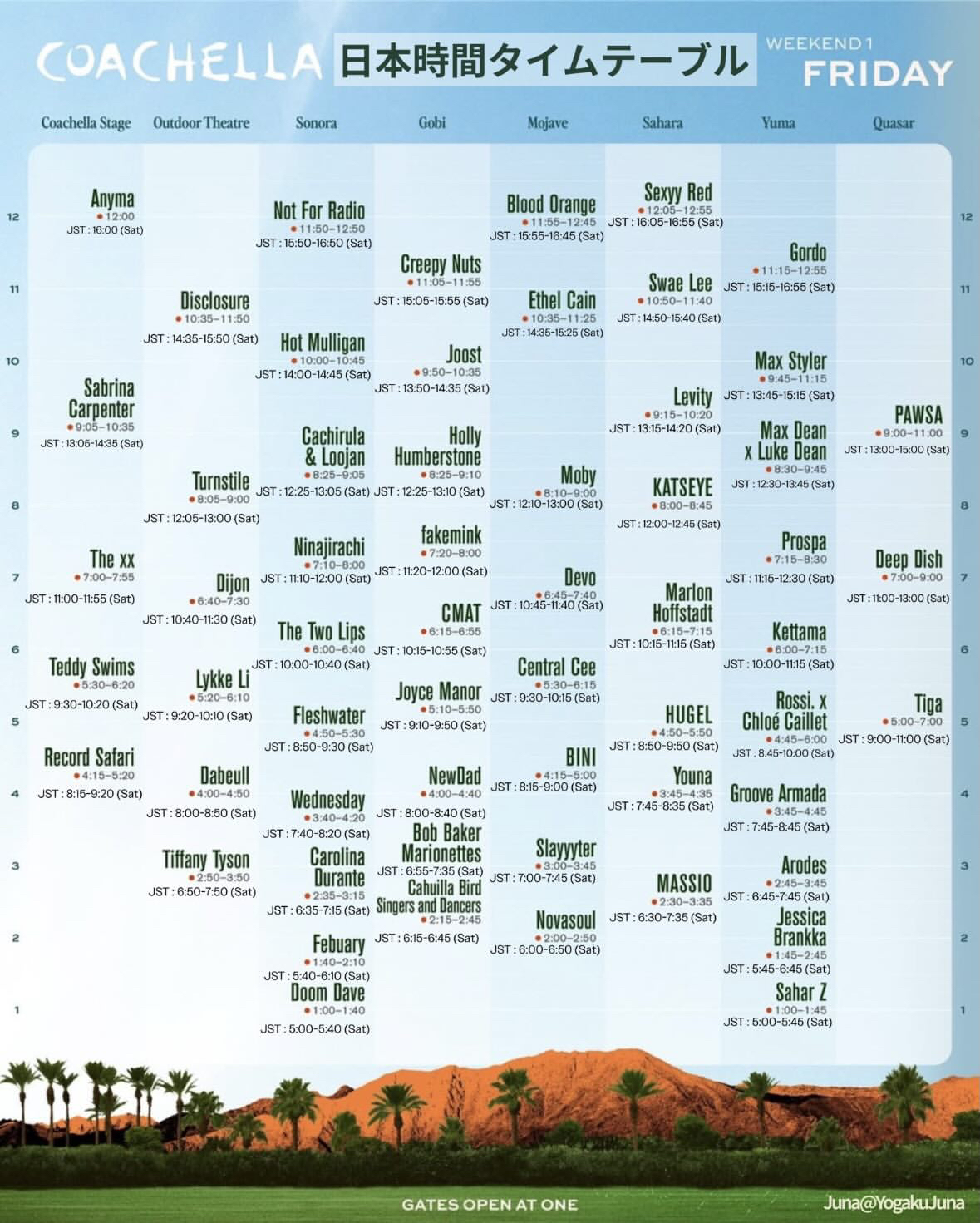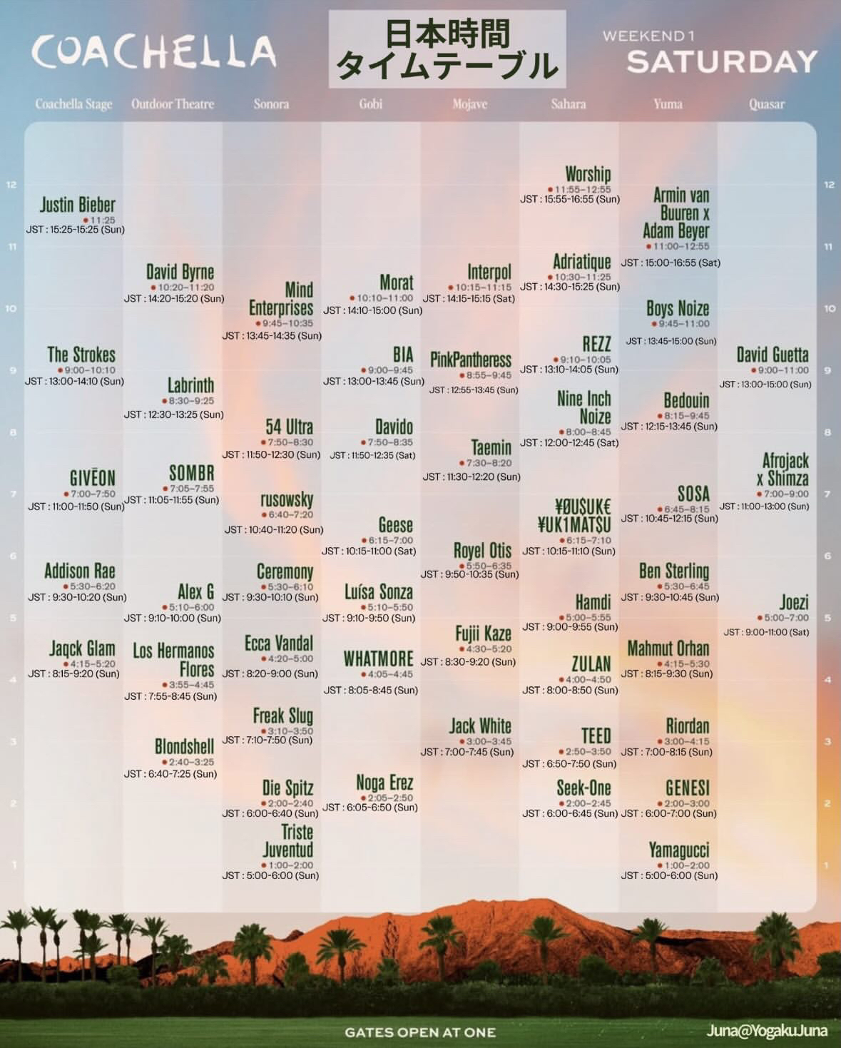 コーチェラとアウトドアの2つの野外ステージと、世界の沙漠が名付けられた5つの巨大テントステージ、そしてQuasarというサブステージ。8つのチャンネルで同時配信されるから、どのチャンネルを見るのか、悩んでしまうのは間違いない。