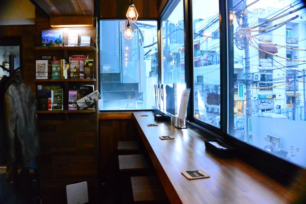 窓際のカウンター席は、静かに飲めてお一人様にはおすすめ。とくに夕暮れの窓際、薄暗い空に琥珀色が映えて目にも楽しい。本を読んだり、ゆっくり過ごせる。