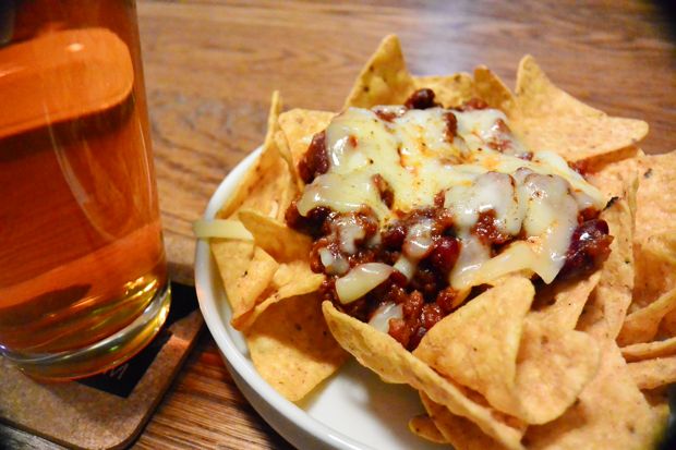 チリビーンズ・ナチョス900円。トルティーヤチップスに、熱々のチーズがトッピング。ビールのうまさがますます引き立つ。