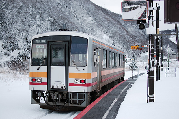 最寄り駅は、大糸線「平岩」駅(無人)。山深い懐を縫うように走るキハ120形は、鉄道ファンならずとも気分があがる。©Makoto Hatano