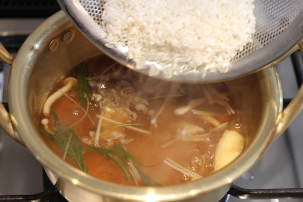 当たり前のこの事実、毎日ごはんを食べる私たちはちょっと忘れがちなんですよね。この再発見は、つまり鍋のためにごはんを炊かなくてもいい=おじやには研いだだけのお米を入れて火にかければよい、ということへ行きつきます。