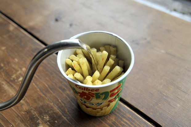 次にお湯を沸かしてじゃがりこのカップへ注ぐんだけど……このときは、さきほどとは少し違い、じゃがりこの長さの半分より少ないくらいの湯量にしておくのがポイント!