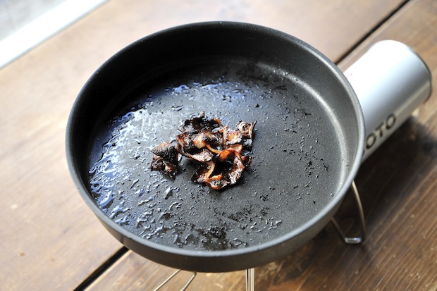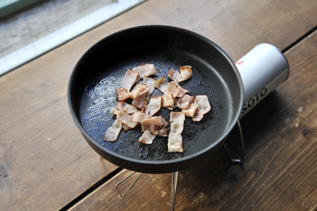 まずは下ごしらえとしてベーコンを小さくカットしてフライパンで軽くソテー。油が出てきて焼き目がついたら、半分をじゃがりこのカップの中に投入。残りの半分はそのまま加熱です。