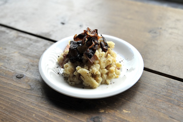 じゃがりこの下半分にお湯を吸わせたのを確認したら、黒コショウとマスタード(あれば乾燥ローズマリーをほんの少し)を入れてマッシュ。上半分がカリカリの食感を残したままマッシュできるのが理想です。最後のにカリカリベーコン(とローストガーリック)をトッピングすれば、歯ごたえがよくておいしいジャーマンポテトのできあがりです。