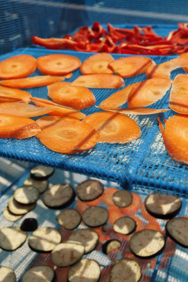 裏技としては車の運転席の前に広げるのも効果的。日が当たる車の中は温室効果で温度が上がるので、天日干しの終盤になって最後の水気が抜けづらいときに使うと、野菜をパリッと干しあげることができます。