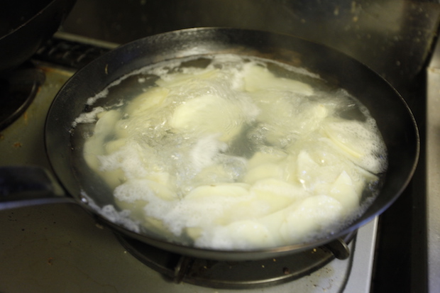 湯通しは軽く火が通る程度でOK。どういうわけか、軽く茹でたものを干すと2回目に火を入れるときにすぐに火が通る
