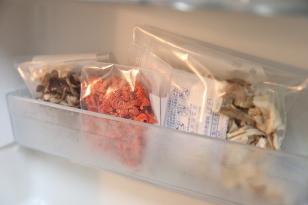 干したあとは、乾燥剤を入れて冷暗所へ。水分量にもよるものの、数週間〜数か月は保存が可能