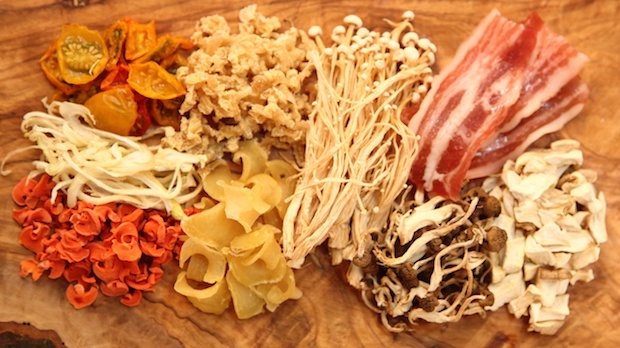 干し上がった野菜たち。ミニトマト、玉ネギ、ニンジン、ダイコン、ゆでジャガイモ、エノキダケ、シメジ、エリンギ。右上は一緒に干したベーコン