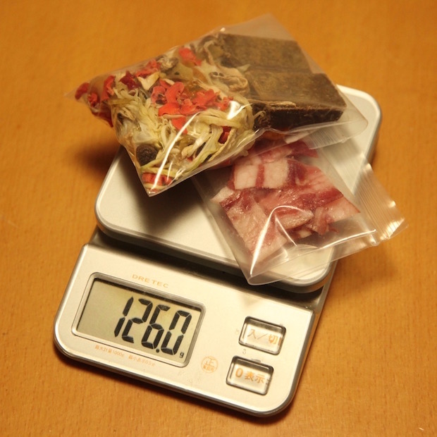 2食分のビーフシチュー。市販のルー、干し野菜、乾燥ベーコンをワンセットにしてこの重量!