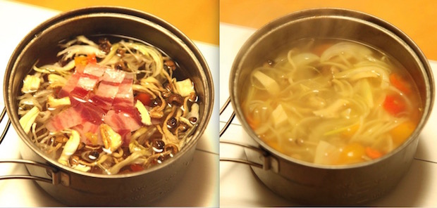 お湯で戻る干し野菜のビフォア&アフター。左は水に入れてすぐ、右は火にかけて10分後。生から茹でたときよりも甘みが強くなる
