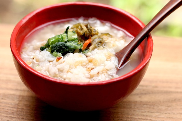 食感はあまりドロリとさせず、サラリと仕上げるのが茶がゆの特徴。器に盛ったら葉とうがらしや梅干しなどを添えて完成。寒い日も去ることながら、真夏の暑い朝にもとってもオススメ。