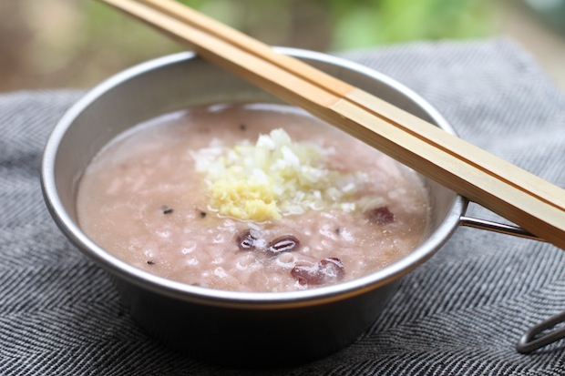 こちらは、白米もおいしいのですが、お赤飯(コンビニのおむすびでも!)で作ってもとてもおいしいです。分量はお赤飯のおむすび2個に対して80〜100mlのゴマ油、1リットルの水を用意しましょう。煮込むほどにゴマ油が乳化しておかゆになじみます。ドロッとしたお米の中へ油がサラリと入り込み、それがなんとも美味! 身体が芯から温まるので、焚き火が恋しい季節にこそ食べてほしいおかゆです。