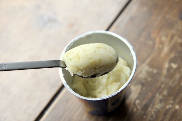 前回同様、まずは沸かしたお湯をじゃがりこが半分浸かるくらい注いだら少しマッシュ。そこに片栗粉をスプーン山盛り1杯を入れて、さらにマッシュというかスプーンの裏でこねる感じ。少しまとまったらもう!杯入れてこねる。