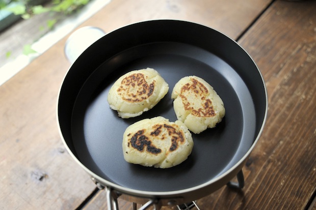もちもちとしたひと塊になったら、スプーンをうまく使ってひと口サイズに生地をまとめたらあとはフライパンや小鍋などで焼くだけ。テフロン加工してあった方がいいけど、ないならないでクッキングシートとかテフロン加工のアルミホイルを使うとくっつかなくてGood!