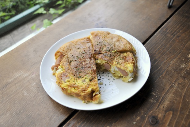 じゃがりこのサクサク感の残るスペイン風オムレツのできあがり。シンプルながら主食にもつまみにもなる優等生レシピですよ。