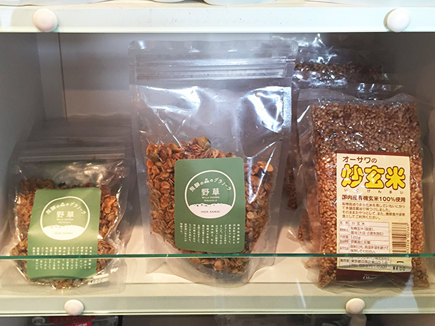高 よもぎって、とてつもなく栄養があるんですよね。ほうれん草の10倍の食物繊維があるし、美肌効果もある。独特の苦味があるし、炒めものに混ぜたり、お茶にして飲んでもいいんじゃないですか? お、エゴマや大豆が入ったグラノーラがある。岐阜飛騨で採れた野草を使っているみたいですね。トレイルミックスに混ぜたりするのかな。