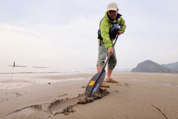 このマテガイ、春の瀬戸内海をシーカヤックで旅するなら格好の獲物になる。砂地の干潟があればおおむね生息しているし、掘る道具としてパドルが流用できる。また、砂抜きせずに調理できるので旅の自炊メシ向きだ。
