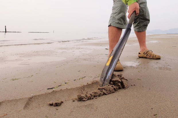 ①干潟の砂地の表面を削っていく。道具は鍬が一番いいが、パドルやスコップでもなんとかなる。